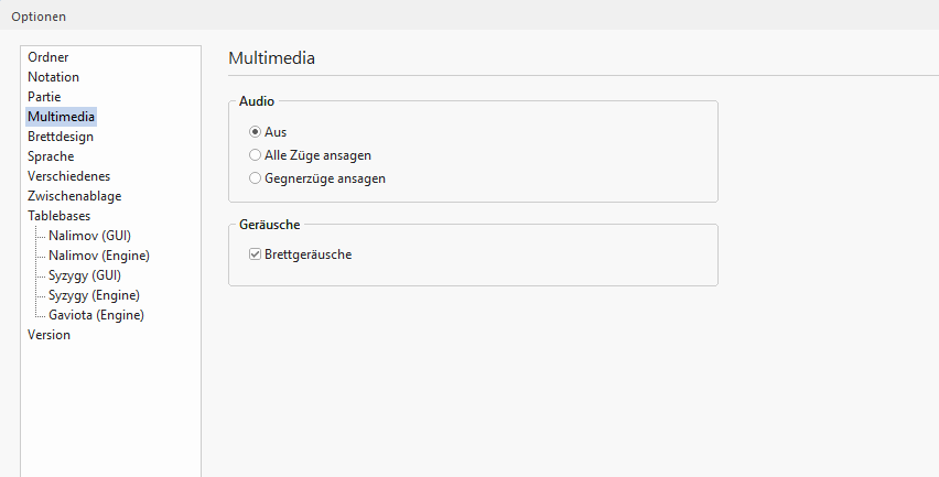 Neu im Pogramm sind zahlreiche alternative Brettgeräusche. Wenn Sie unter den Optionen – MultiMedia die Brettgeräusche aktiviert haben, spielt das Programm während der Partie unterschiedliche Sounds für Zug- und Schlaggeräusche ab.